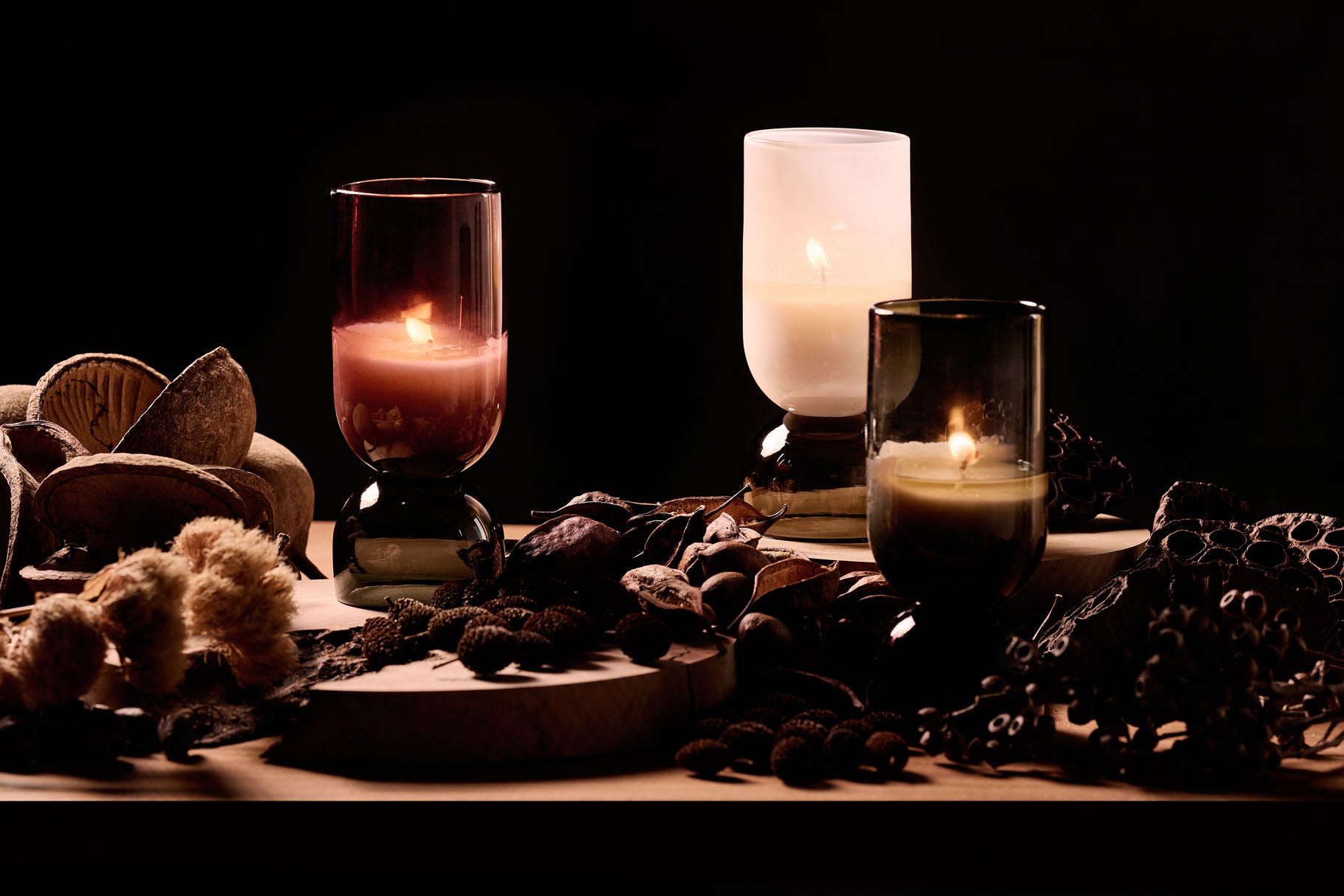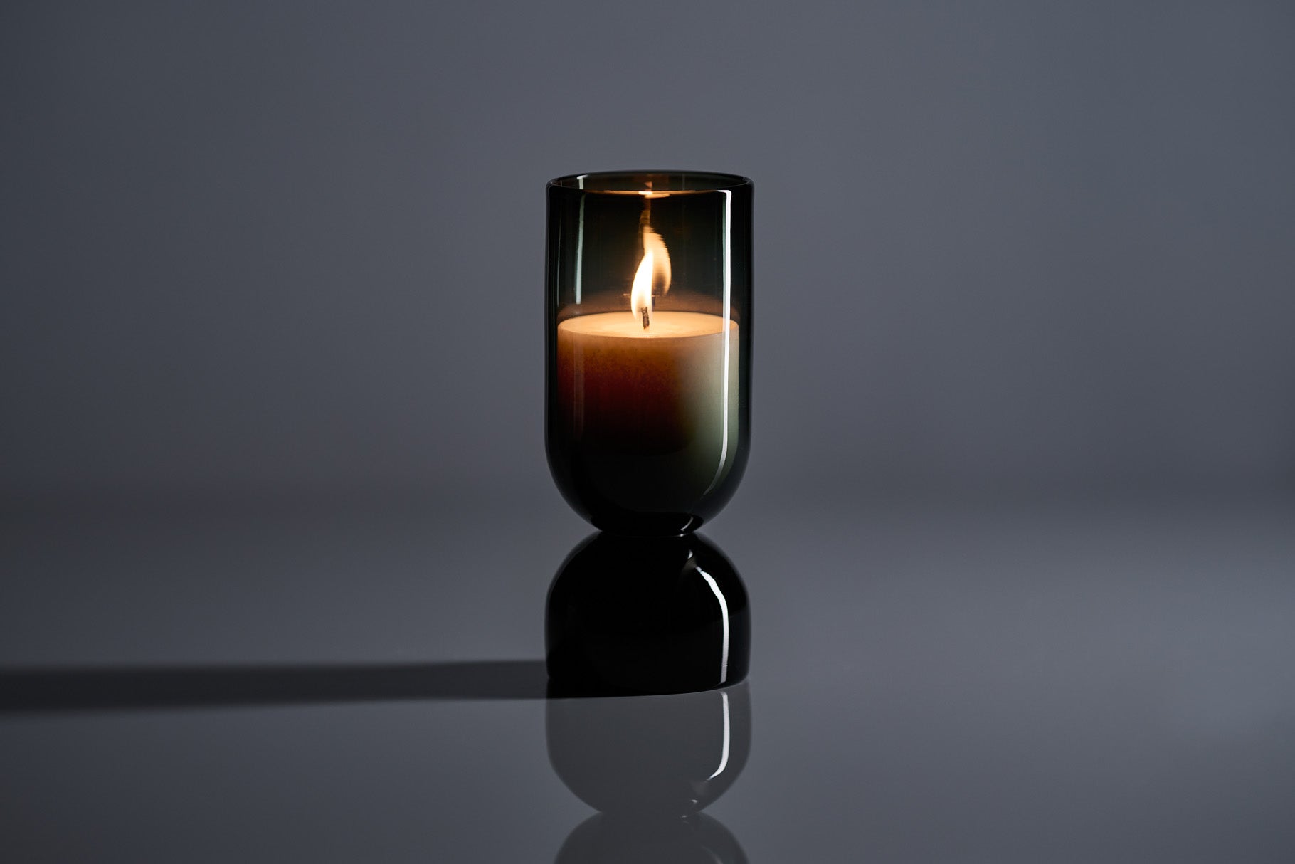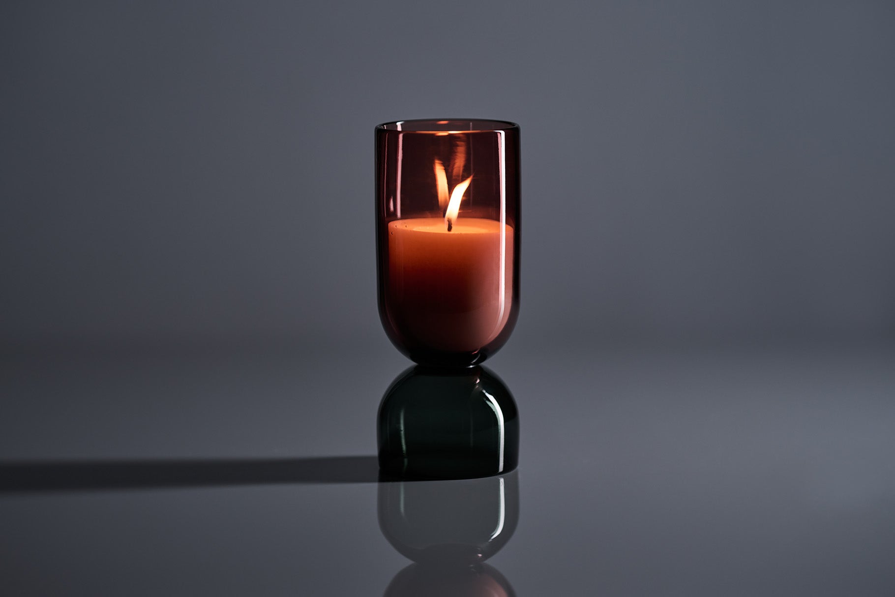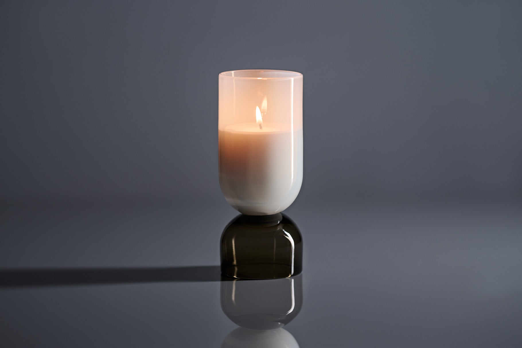 深さのあるホルダーは炎の揺らぎを生み出す構造となり、ガラスを透過した光はより柔らかく、ガラス面に映り込む光が重なり合うことで幻想的な情景を生み出します。greyとpurpleは炎のゆらめきを感じられる色味、opalは眩しさを抑えつつ光をやわらかく拡散させます。専用のキャンドルリフィルとあわせてご使用ください。