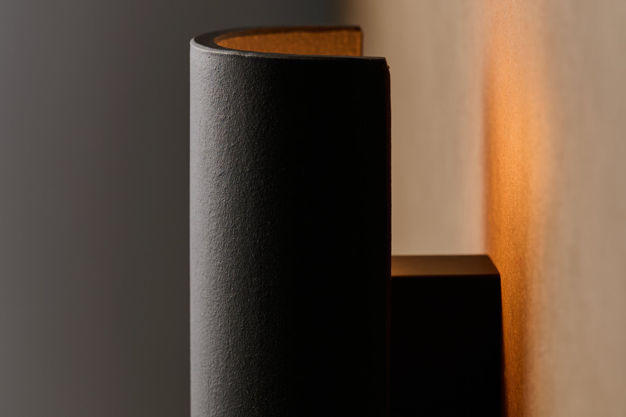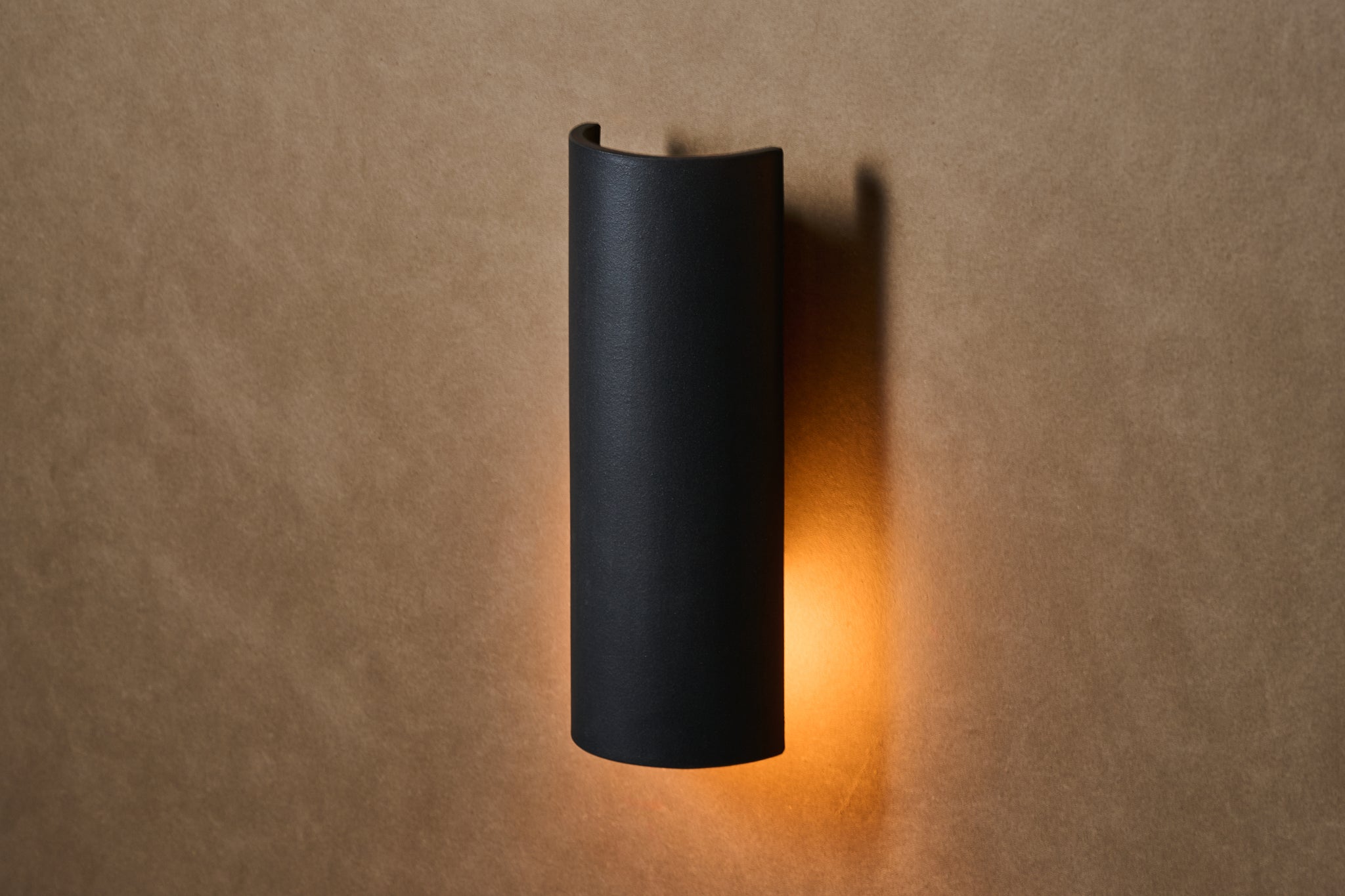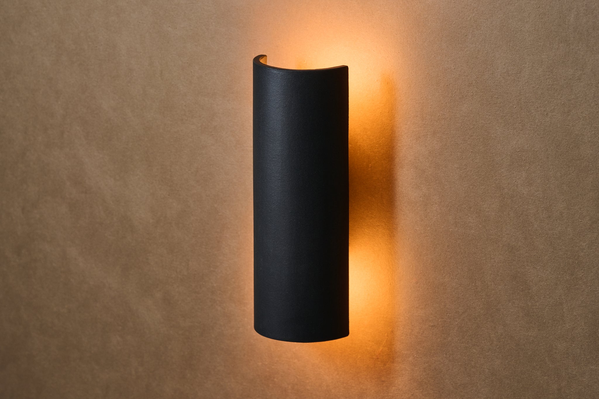 日本三大瓦の産地の一つ、淡路瓦の製瓦所で制作した軒下用のブラケットライト。瓦と同じ土を使ったシェードは、マットな質感で土のテクスチャーを感じさせます。燻瓦と同じ窯で焼成することで黒く発色させています。点灯するとシェードの背面に光が広がり、壁の素材を浮かび上がらせます。上下配光のup down、下向配光のdownの2種類があります。03は半円型のシェード。