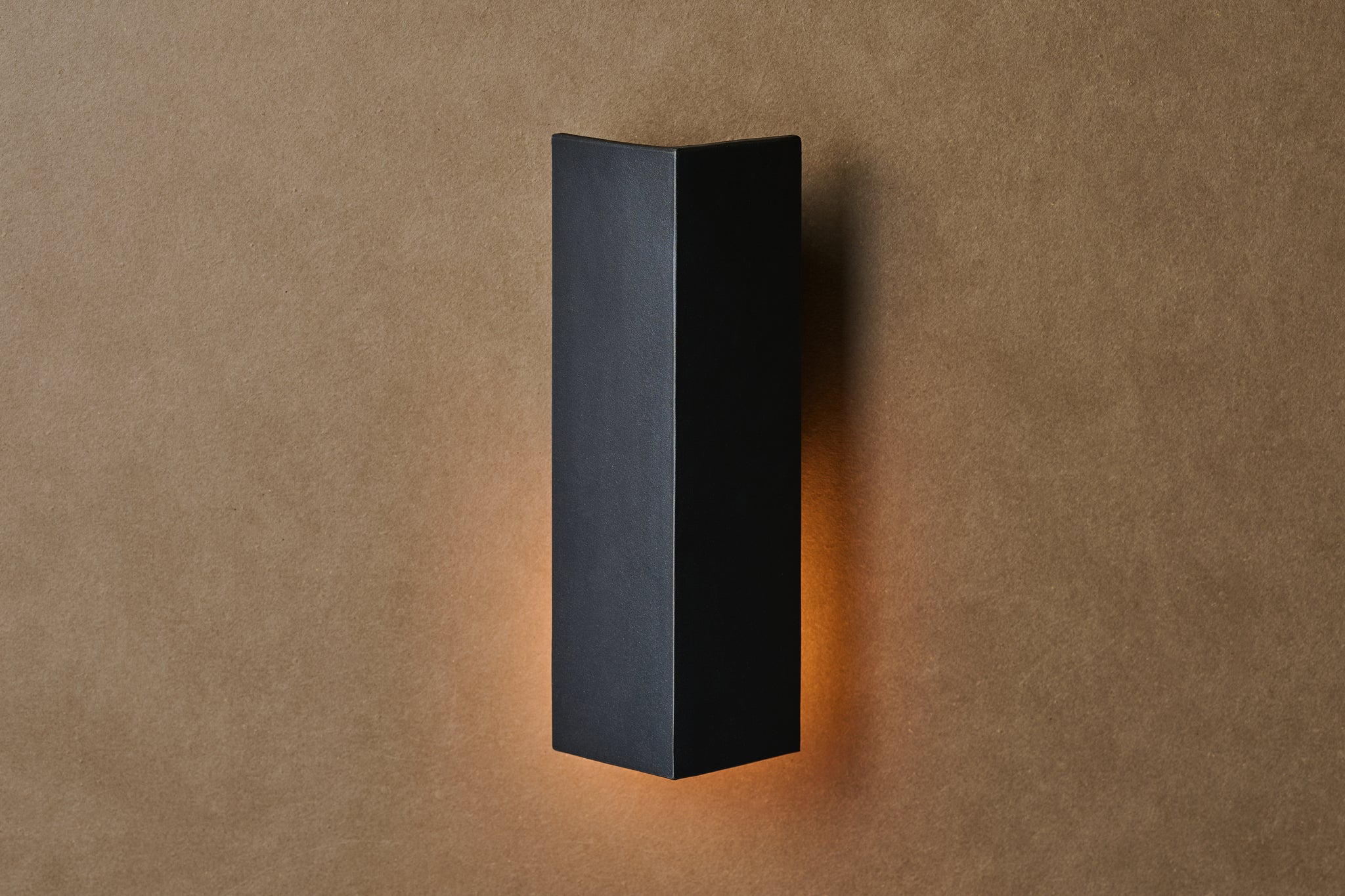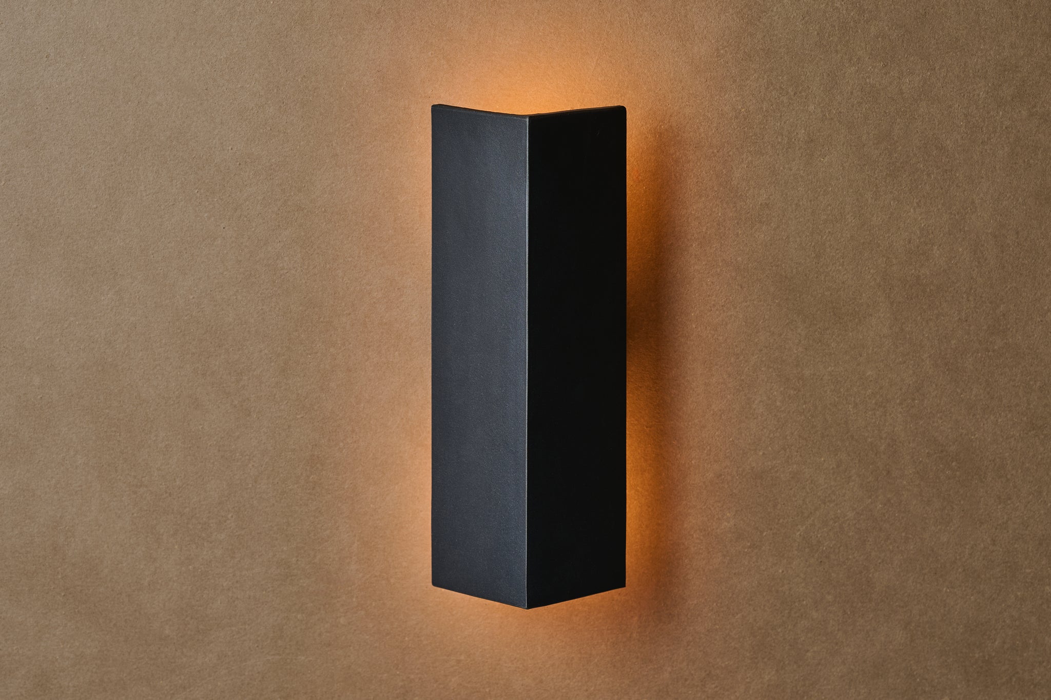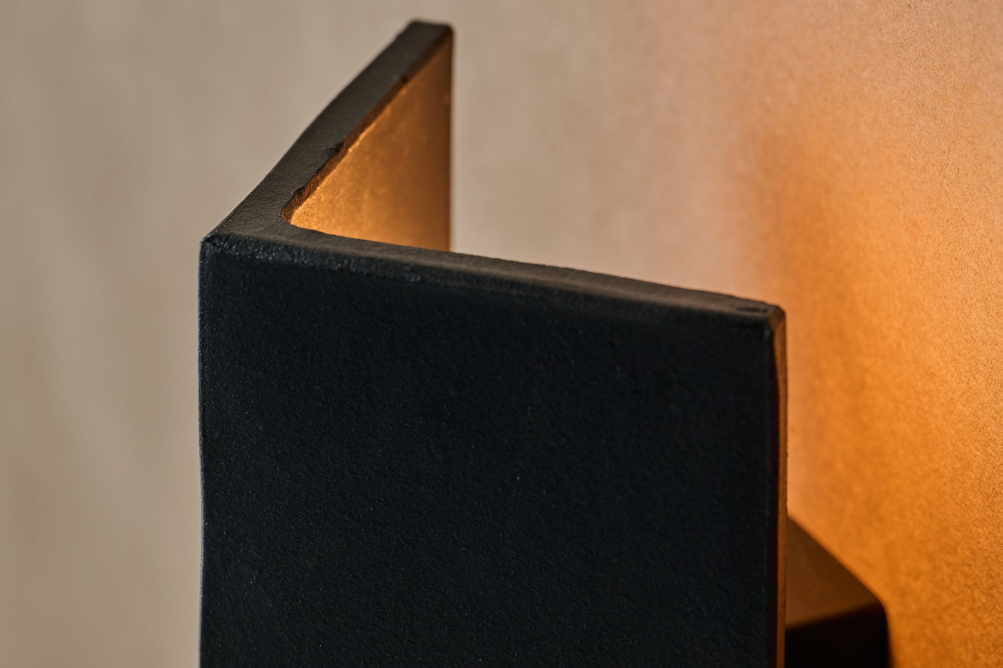 日本三大瓦の産地の一つ、淡路瓦の製瓦所で制作した軒下用のブラケットライト。瓦と同じ土を使ったシェードは、マットな質感で土のテクスチャーを感じさせます。瓦と同じ土を使ったシェードは、マットな質感で土のテクスチャーを感じさせます。燻瓦と同じ窯で焼成することで黒く発色させています。点灯するとシェードの背面に光が広がり、壁の素材を浮かび上がらせます。上下配光のup down、下向配光のdownの2種類があります。04はV型のシェード。