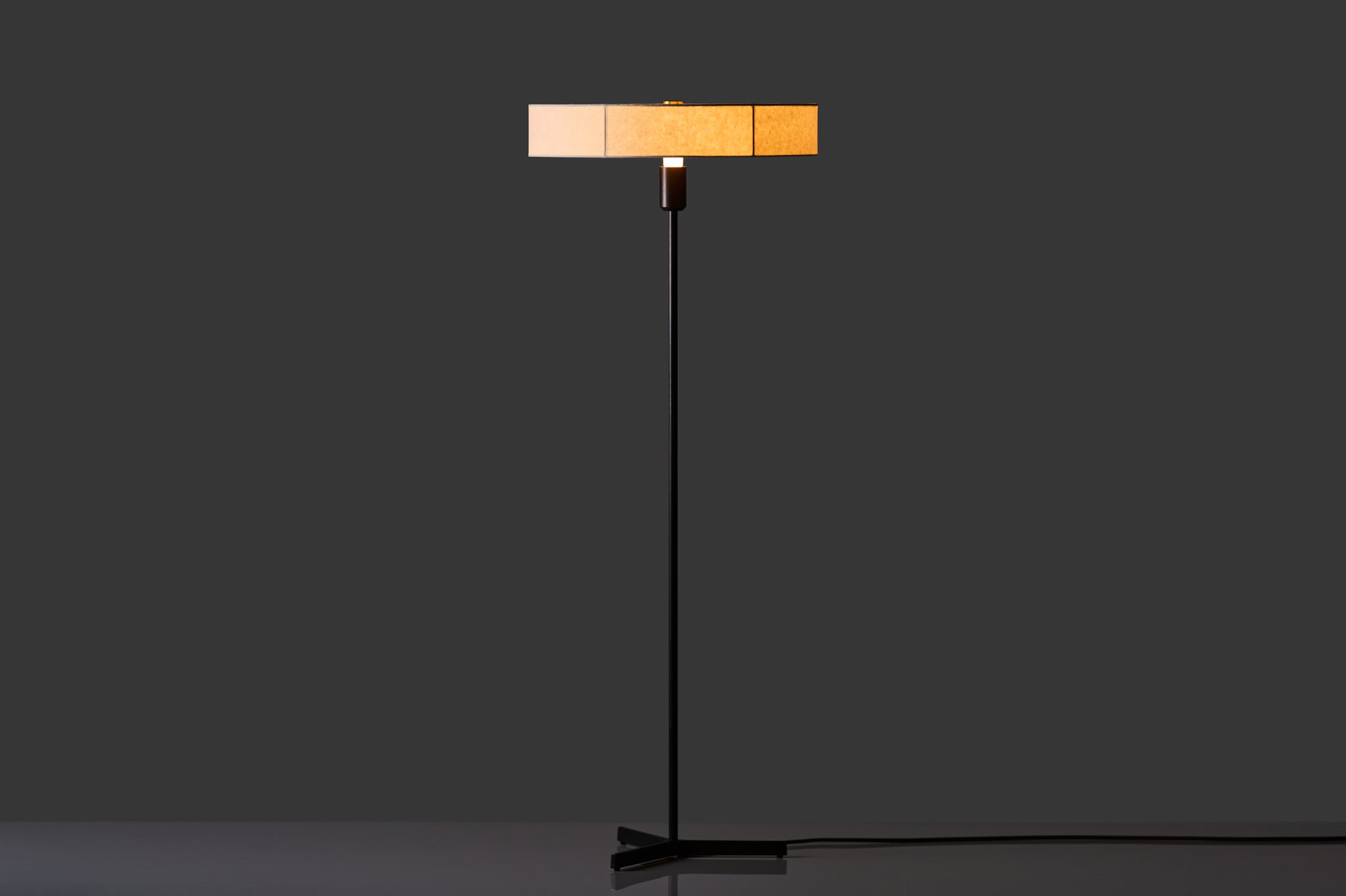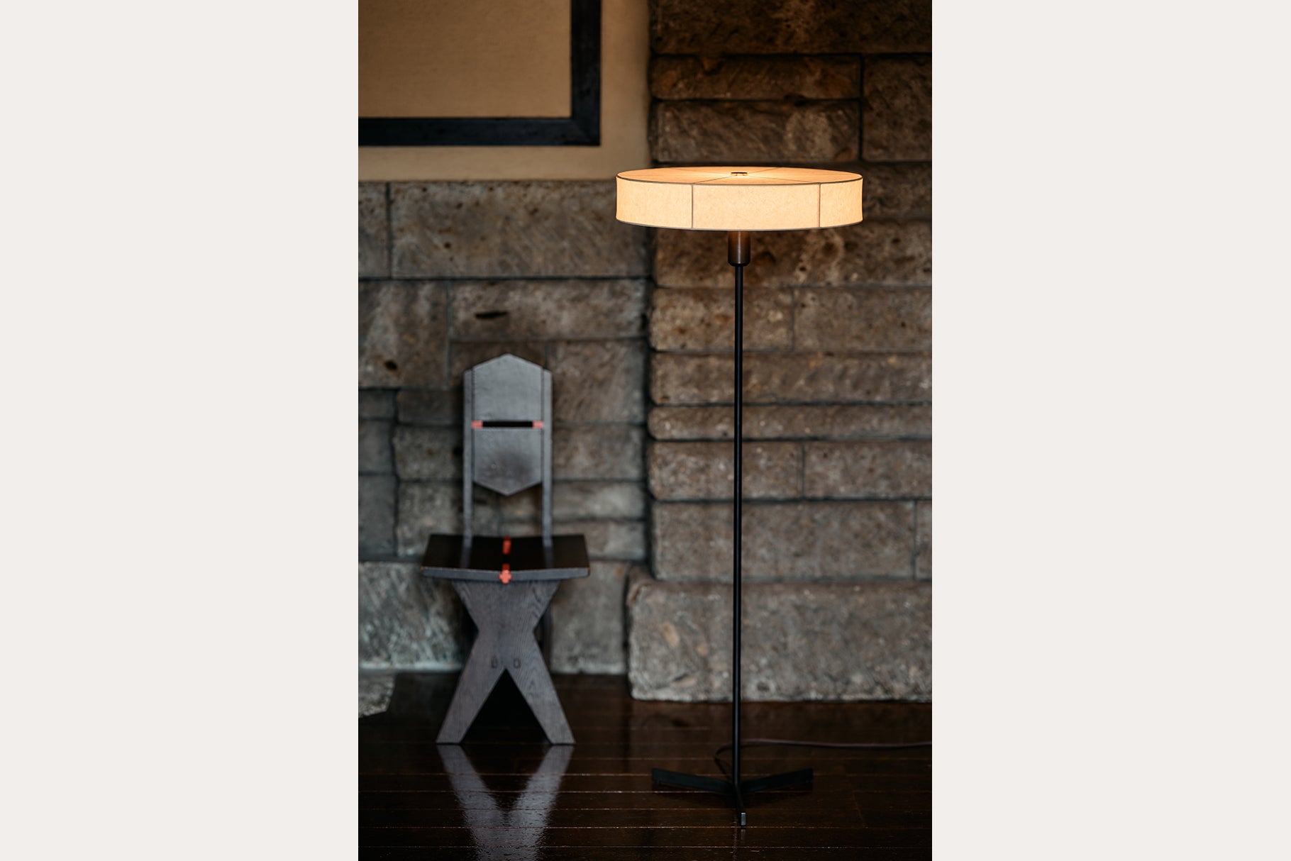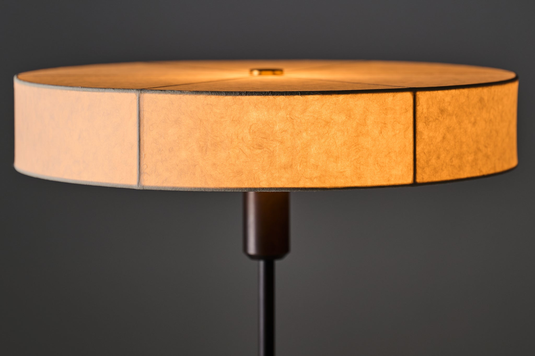 日本の古い編笠から着想を得た和紙シェードのフロアライト。高さを抑えた和紙のシェードは下面まで張り込んでおり、全方向に光を柔らかく拡散させます。手漉きで作られた丈夫で強い黒谷和紙を使うことで、最小限のフレーム構成を可能にしています。和紙は作家・ハタノワタル氏によるものです。楮の繊維が感じられる手漉き和紙ならではの質感をより引き立てるため、脚やアームの真鍮には黒染めを施しています。