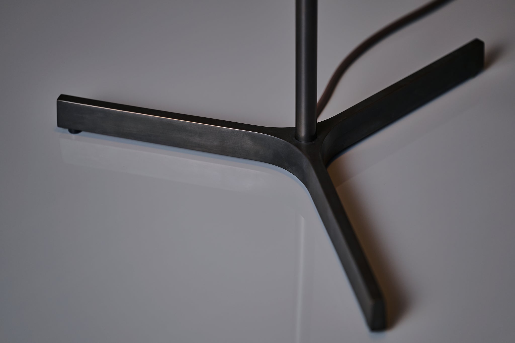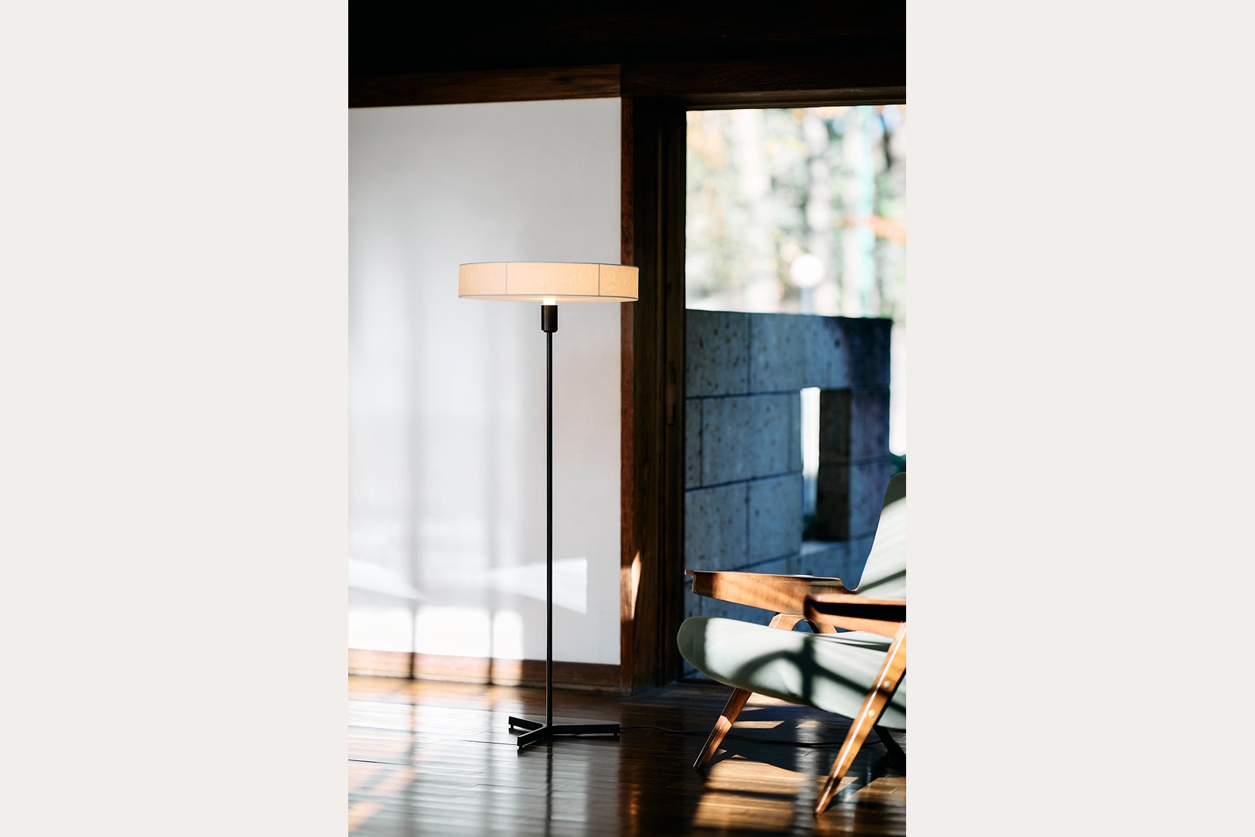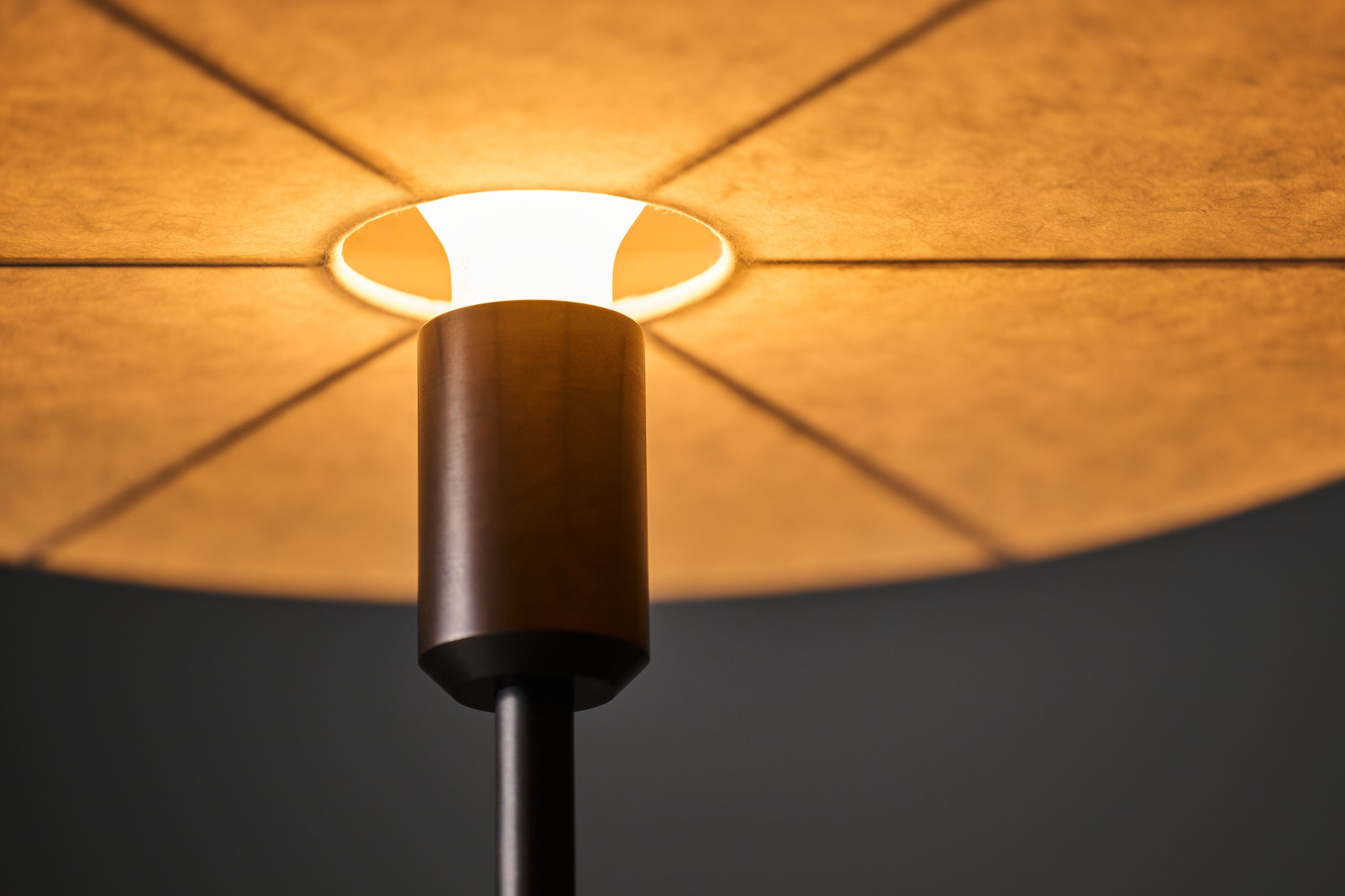 日本の古い編笠から着想を得た和紙シェードのフロアライト。高さを抑えた和紙のシェードは下面まで張り込んでおり、全方向に光を柔らかく拡散させます。手漉きで作られた丈夫で強い黒谷和紙を使うことで、最小限のフレーム構成を可能にしています。和紙は作家・ハタノワタル氏によるものです。楮の繊維が感じられる手漉き和紙ならではの質感をより引き立てるため、脚やアームの真鍮には黒染めを施しています。